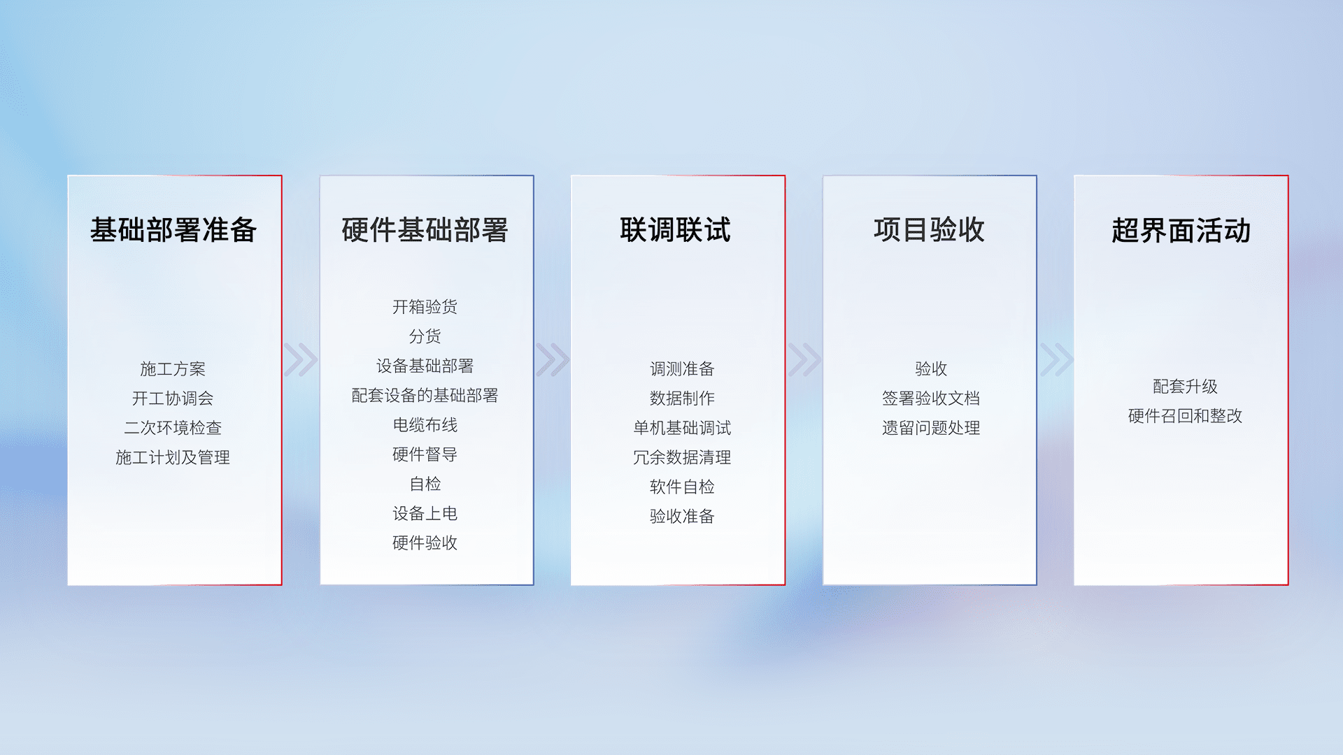 从基础部署准备、、硬件基础部署、、、联调联试、、项目验收、、、、越界面活动的全过程可追溯,,,保证施工质量和进度。。。